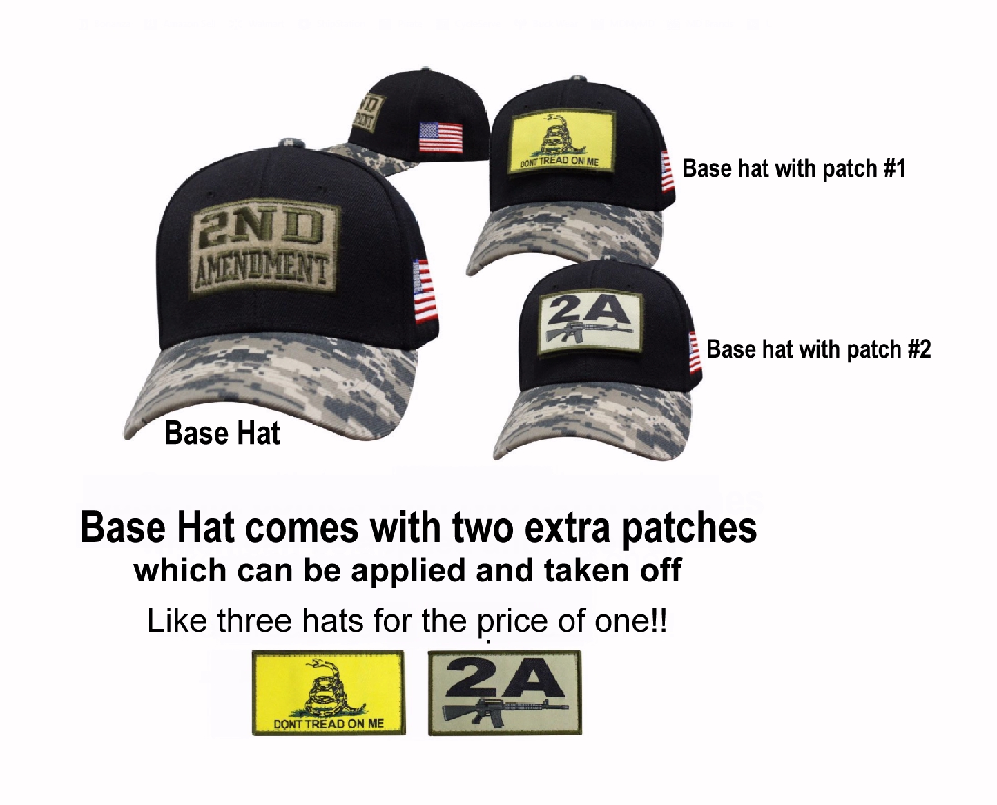 - Base hat comes with 2 additional Woven Label Hook Patches “Don’t Tread on Me” and “2A M16“