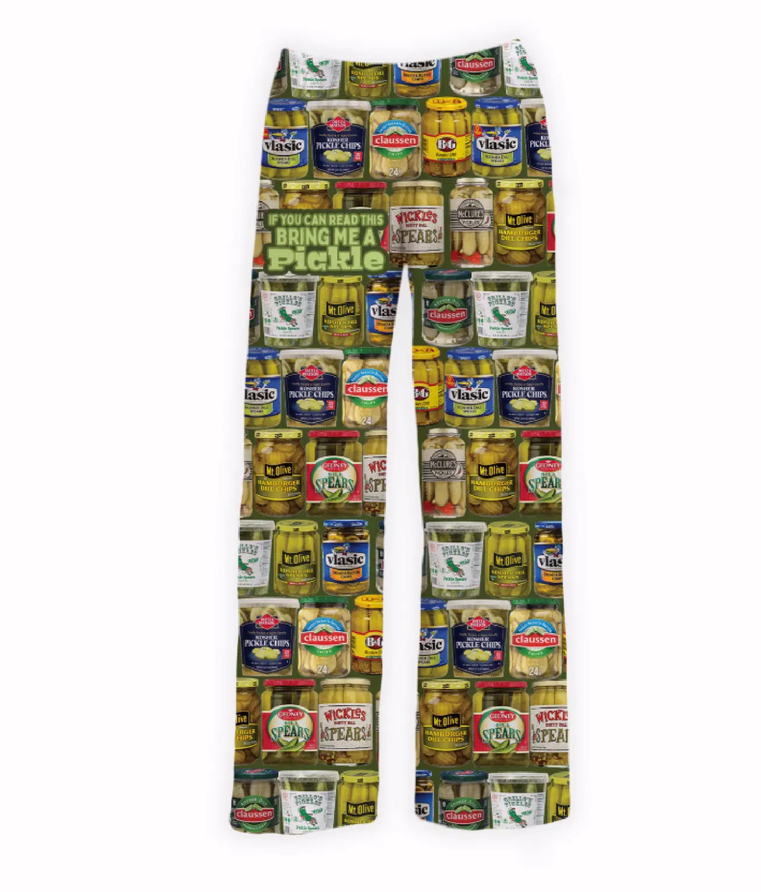 These Brief Insanity Pickles Pickles Pickles Lounge Pants Pajamas are a savory celebration for pickle lovers and relaxation enthusiasts alike. Featuring an array of pickle jars, these cozy pants come with a playful twist: the upper right leg reads, ‘If you can read this, bring me a pickle.’ Embrace comfort with a touch of pickle charm, making a subtle statement that combines lounging and your love for this delightful snack. Perfect for all of the pickle lovers out there!This material is buttery soft and free flowing Items fit true to size, so we recommend ordering your typical size.  The innovative material used to create this product is a specialized polyester blend that mimics the temperature of your body. The light-weight and breathable material provides all-day comfort while wearing.