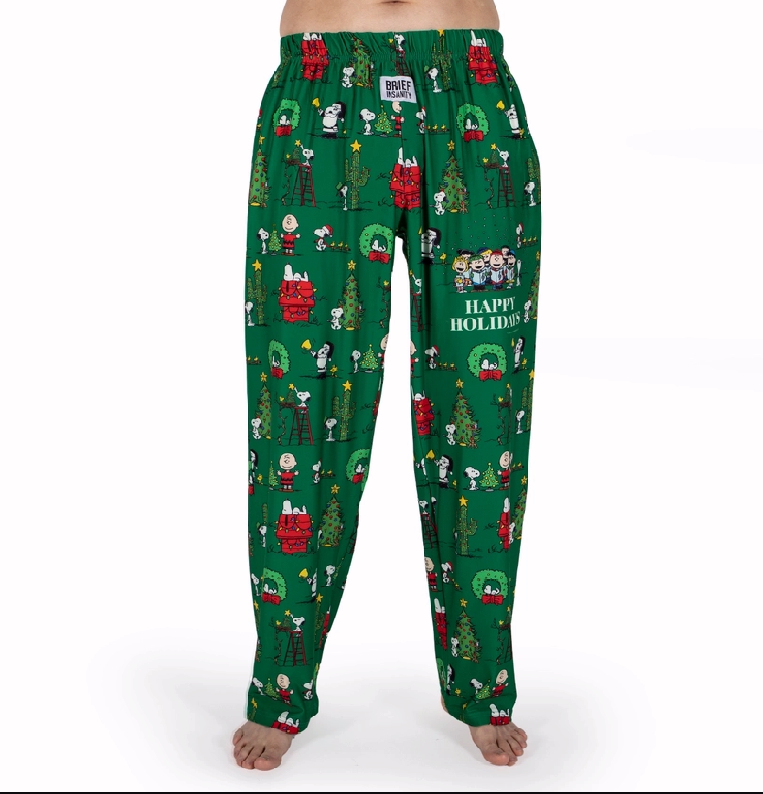 These Brief Insanity Snoopy Happy Holidays Lounge Pants Pajamas are perfect for those people who love the dynamic duo of Snoopy and the holidays. This material is buttery soft and free flowing Items fit true to size, so we recommend ordering your typical size.  The innovative material used to create this product is a specialized polyester blend that mimics the temperature of your body. The light-weight and breathable material provides all-day comfort while wearing.