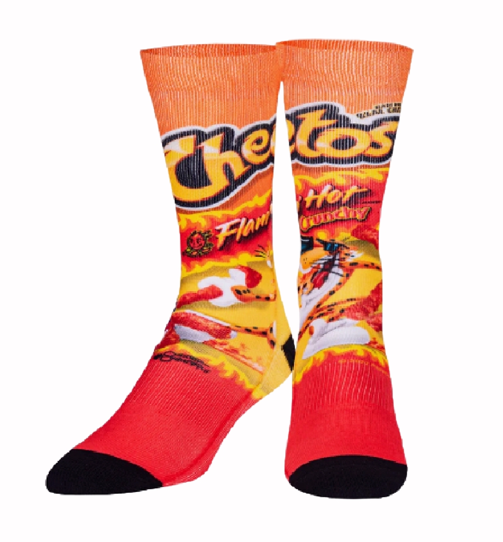 These Flamin’ Hot Cheetos crew socks are on fire! From the officially licensed Frito Lay collection, these Cheetos Flamin Hot Athletic Crew Socks feature the hot and spicy Cheetos logo with chips all over, complete with Chester the Cheetah. The lightweight cotton and soft fabric enhances breathability and coolness to help you withstand the heat.