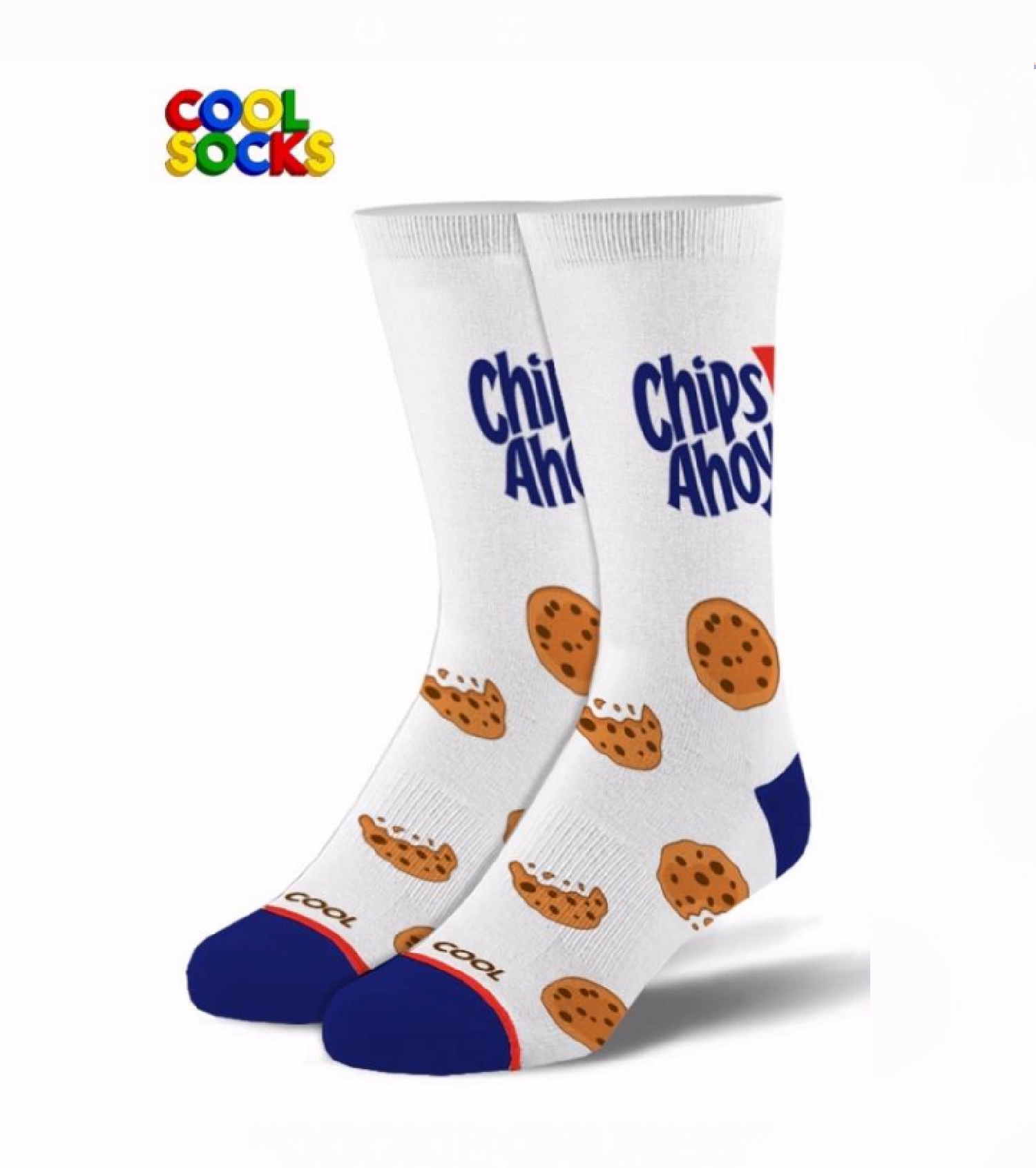 Kick back and relax in these Chips Ahoy Cookies Athletic Crew Socks. These socks feature the Chips Ahoy logo and cookies being eaten. Made with a premium cotton blend for enhanced comfortability and double layered cushion.