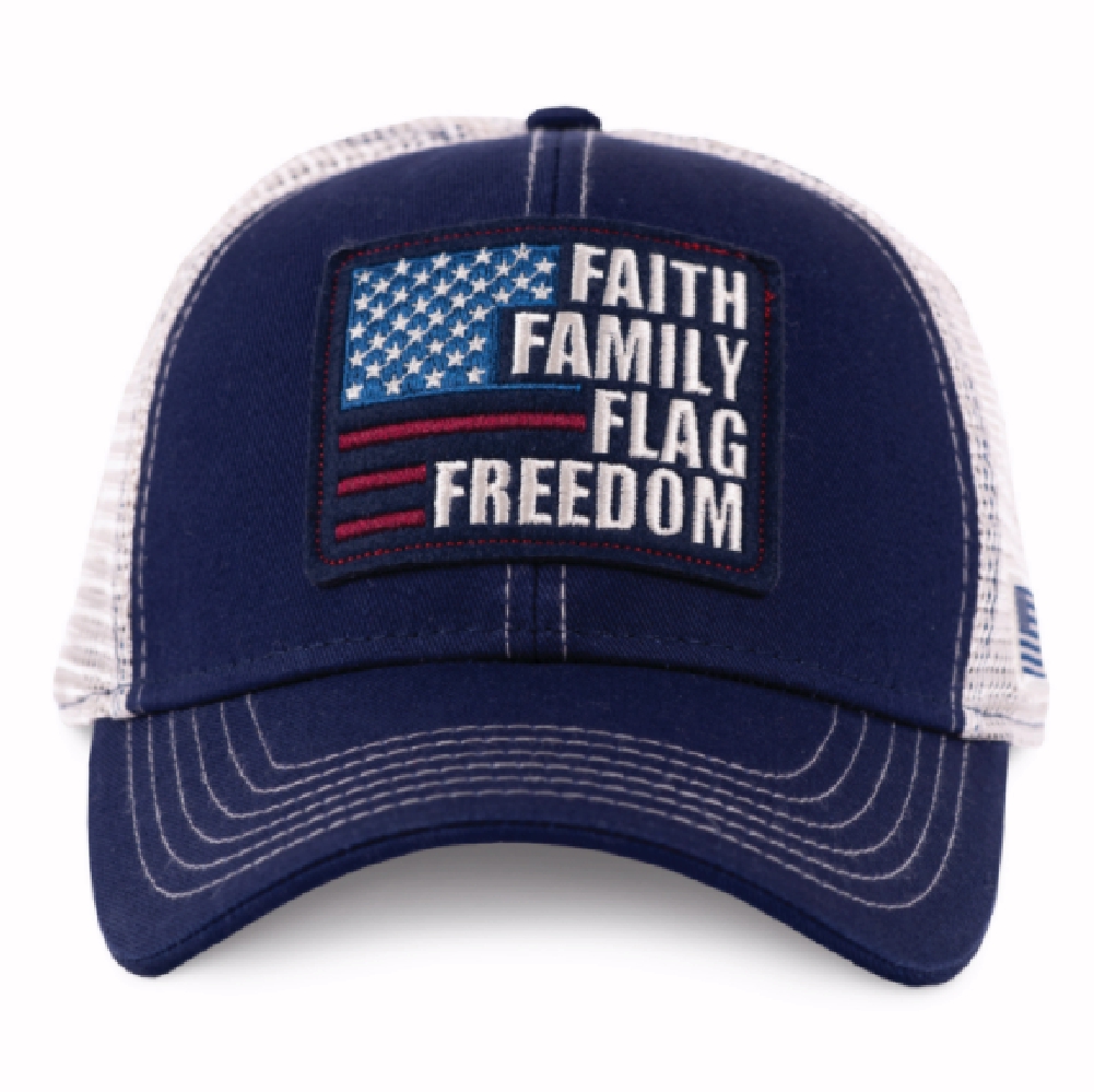 Show ’em who you are from head to toe with our Faith Family Flag Freedom Fundamentals Mesh Buck Wear Cap Hat Perfect companion to our Faith Family Flag Freedom Fundamentals tee shirt. Another quality hat from Buck Wear.