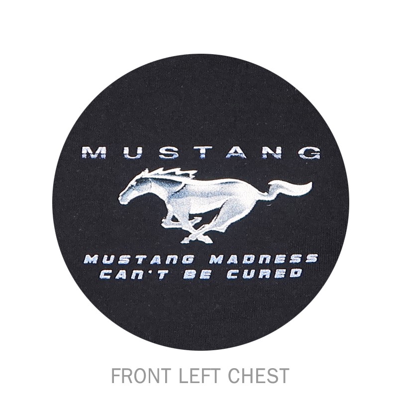 This shirt is the perfect shirt for all of the Mustang addicts out there – Ford Mustang Madness Can’t Be Cured Short Sleeve T-Shirt. This classic style t-shirt features bright colorful illustration of a race track with red, green, and blue Mustangs on the back print, with a large chrome Mustang logo at the top. One of our most popular Mustang designs, this classic tee is sure to be a favorite in anyone’s Mustang shirt collection.