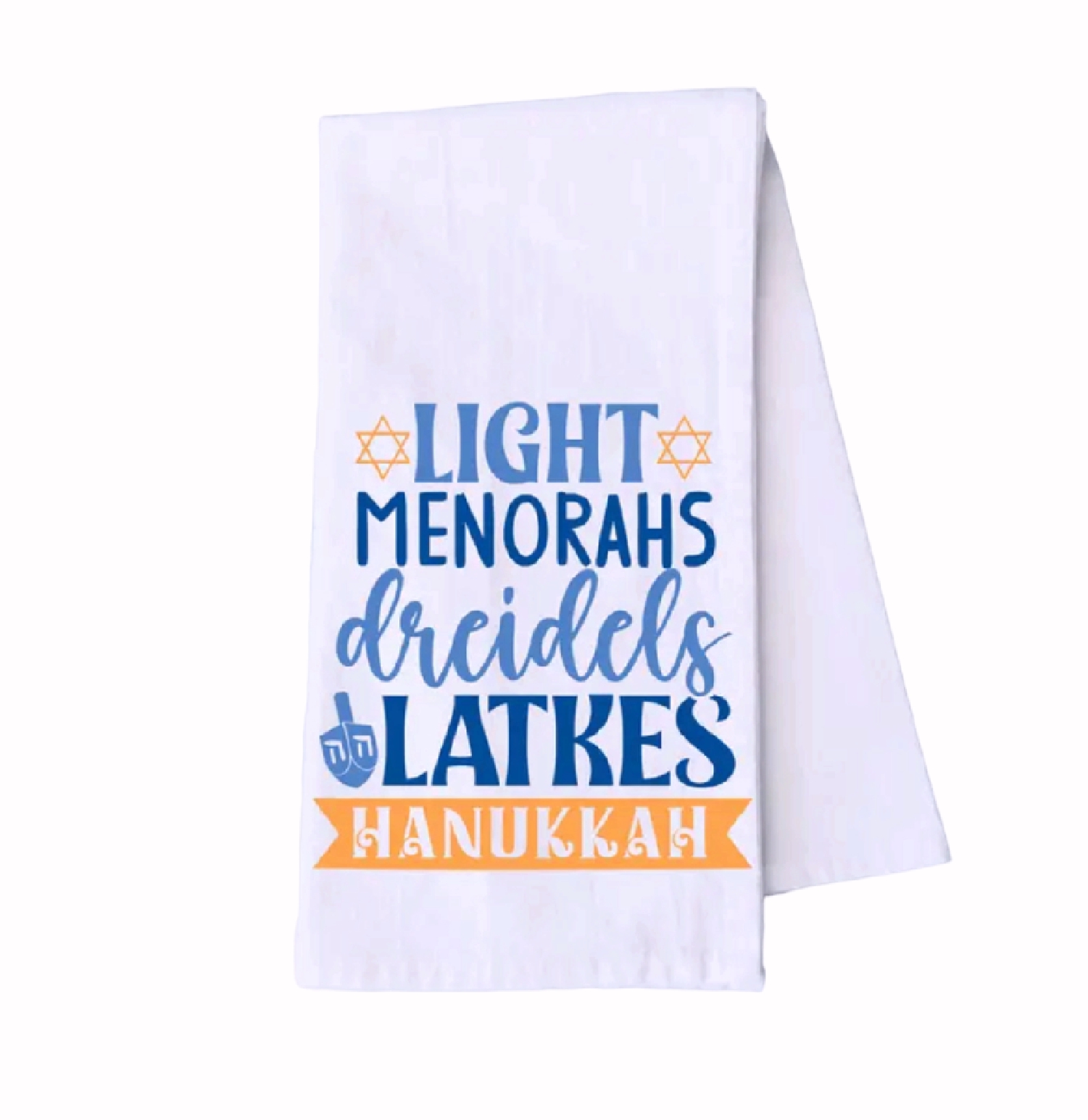 Celebrate Hanukkah with this screen printed Hanukkah Light Menorahs, Dreidels, Latkes Hand and Kitchen Towel. Use it in the kitchen for your dishes or as an accessory as a hand towel in your bathroom. Perfect for your home, housewarming, birthday or holiday gift. They are naturally soft and wrinkly and will soften further with each wash.