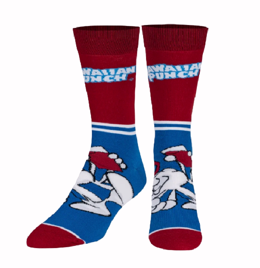 These refreshing sweet Hawaiian Punch Striped Athletic Crew Socks are perfect for a hot summer day. This retro design features the iconic Hawaiian Punch logo on the red cuff and Punchy, the Hawaiian Punch guy on the blue cuff. The lightweight cotton improves comfort and cushion while maintaining breathability and coolness.