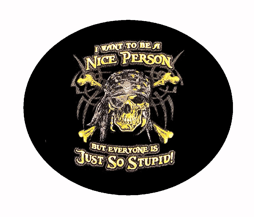 A fun pirate tee with lots of attitude. Featuring an illustration of the classic pirate skull and crossbones. The statement on the back of this tee is “I Want to Be a Nice Person…But Everyone is Just So Stupid!”