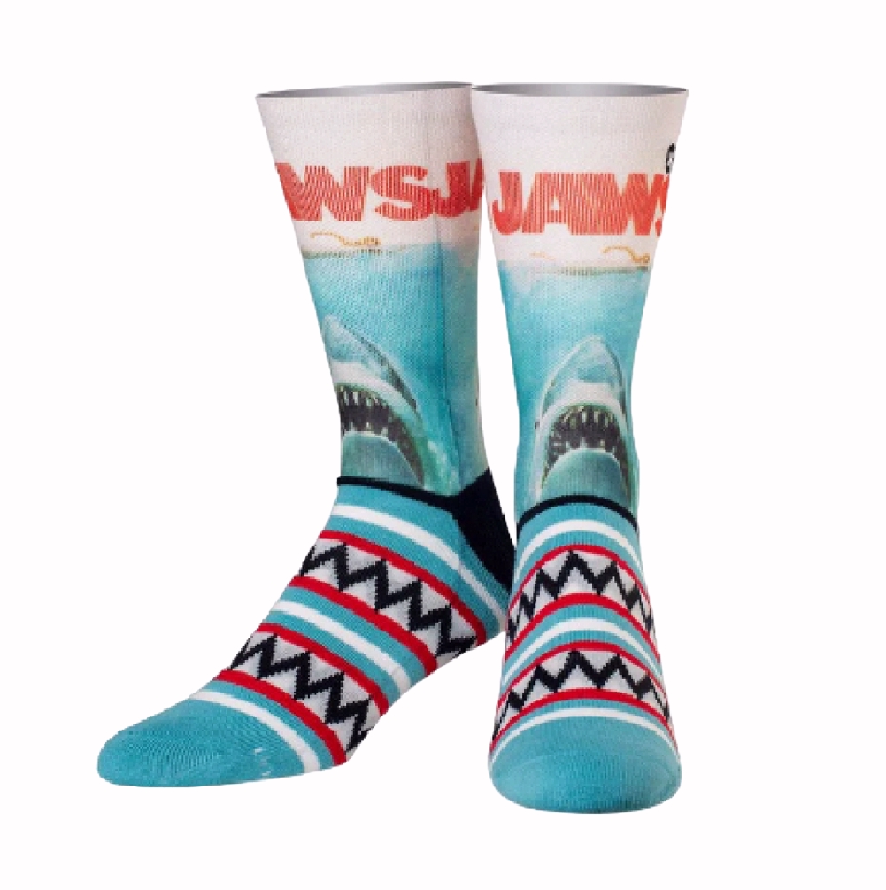 The world’s most infamous killer shark just attacked these Jaws Striped Teeth Athletic Crew Socks. These white and blue socks feature the Jaws title in red and a large knitted graphic of Jaws swimming to the surface. The poly-cotton blend ensure a vibrant and colorful image with no image distortion.