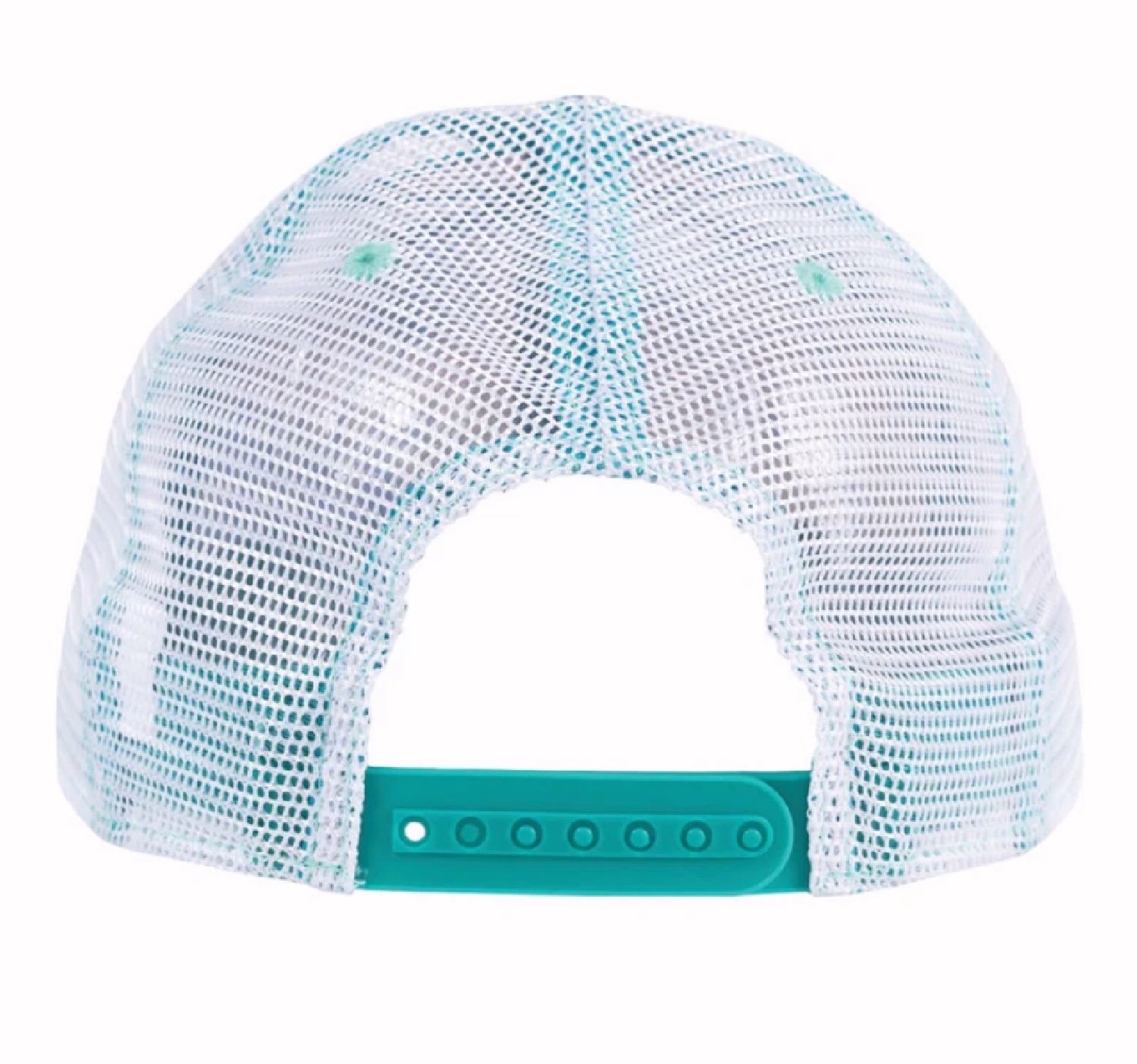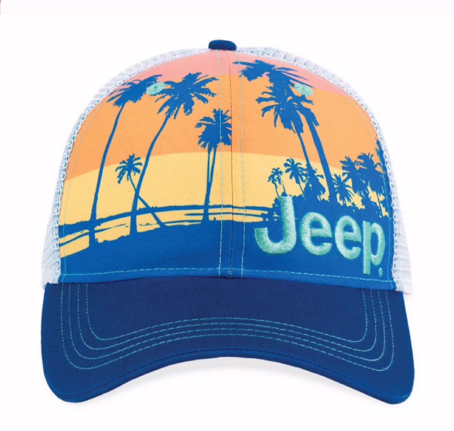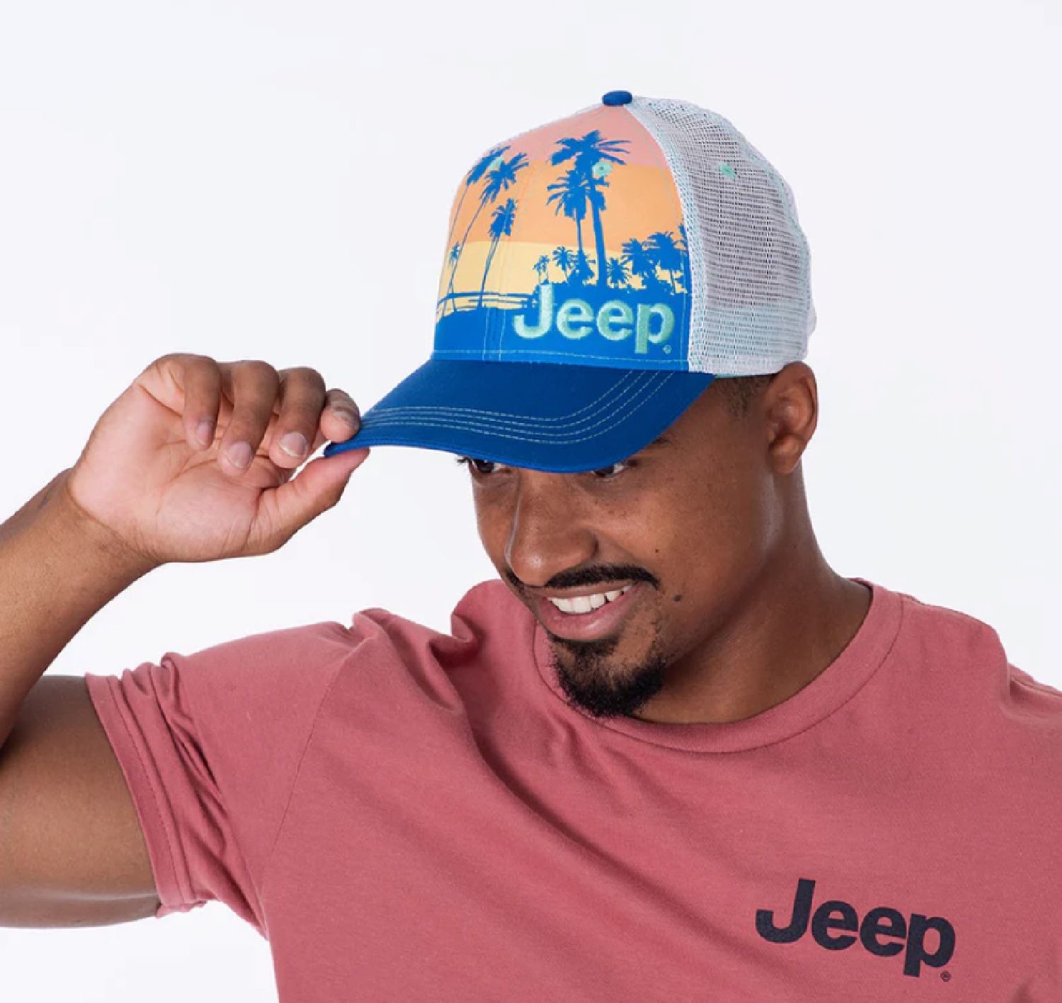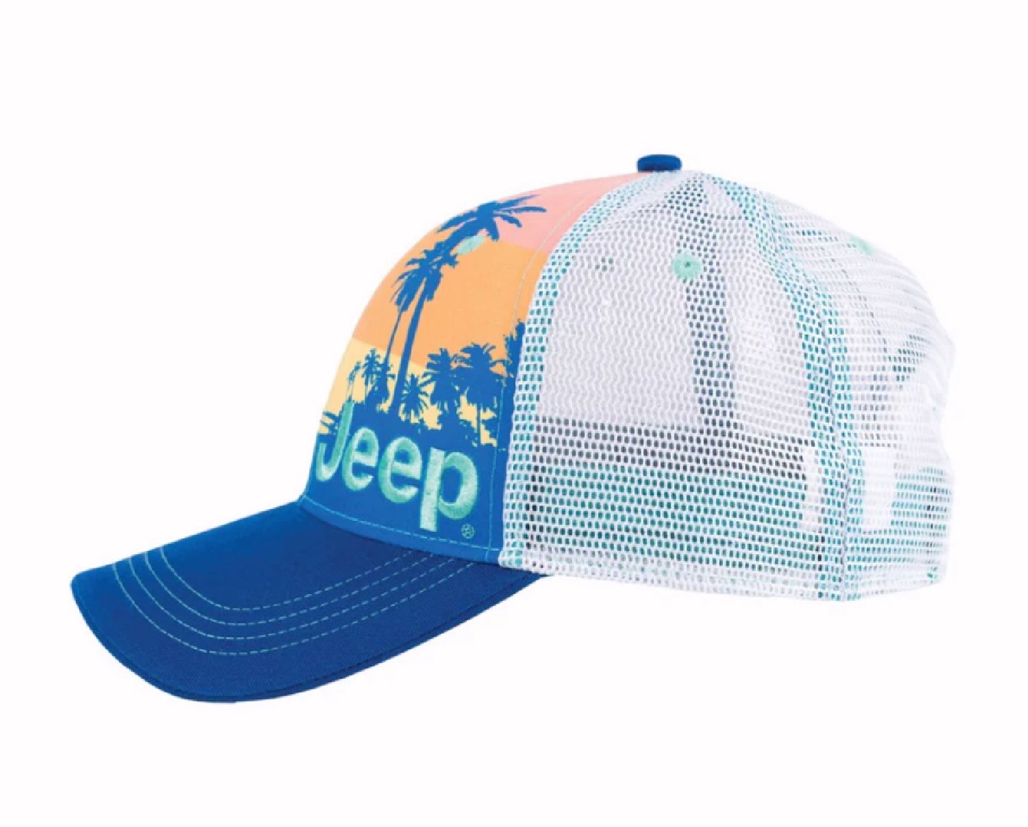 The Jeep® Beach Sunset Embroidered Mesh Cap Hat features a vibrant embroidered beach at sunset scene with the iconic Jeep logo.