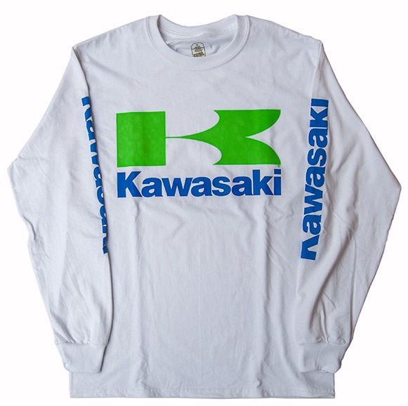 “Let the good times roll!” with this Kawasaki T-Shirt. Kawasaki has always been performance driven. Whether racing your vintage KX in an AHRMA event, or tooling around at the mall– this long sleeve jersey is the perfect way to show your Kawasaki pride.