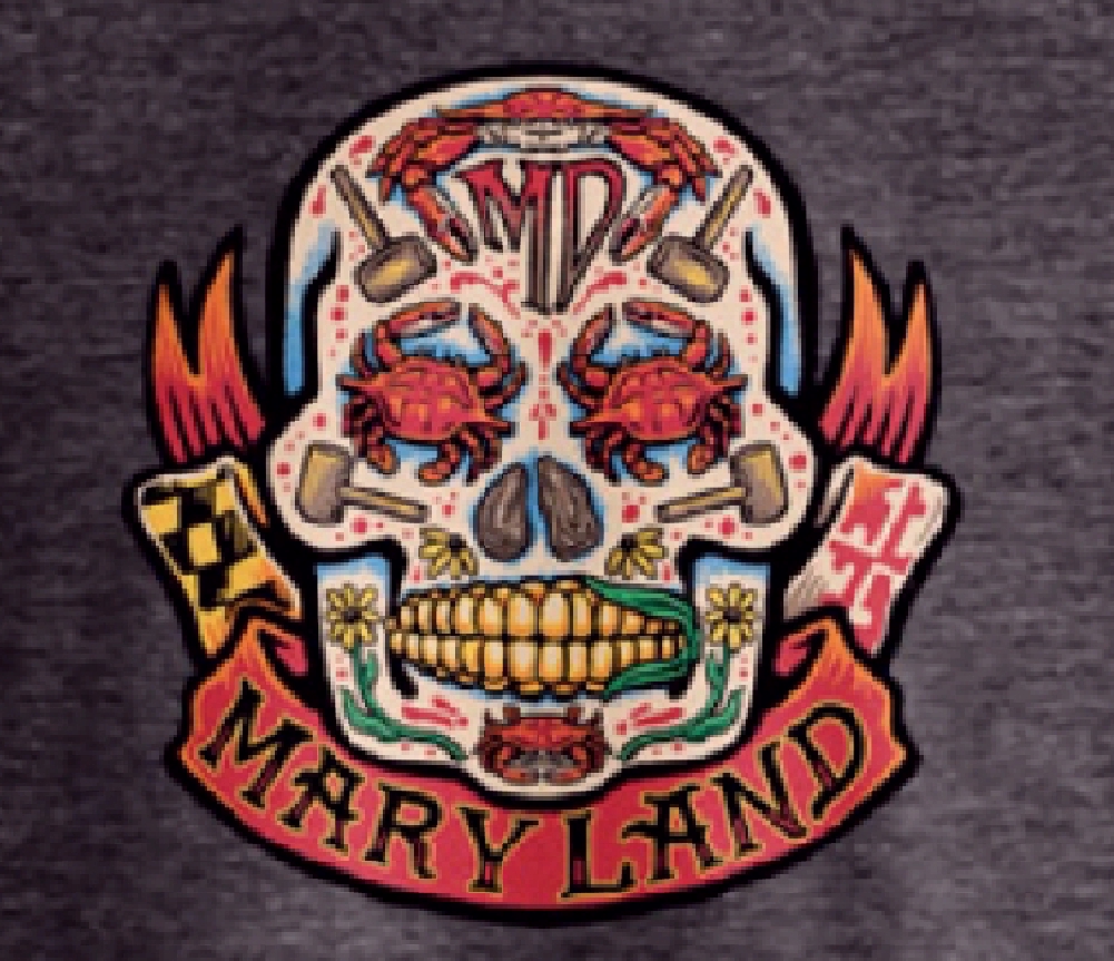 Celebrate good times and your Marylan spirit with our Maryland Crab Icons Skull Short Sleeve T-Shirt. This beautiful unisex adult short-sleeve shirt is constructed of 100% pre-shrunk ring spun 6 ounce cotton.