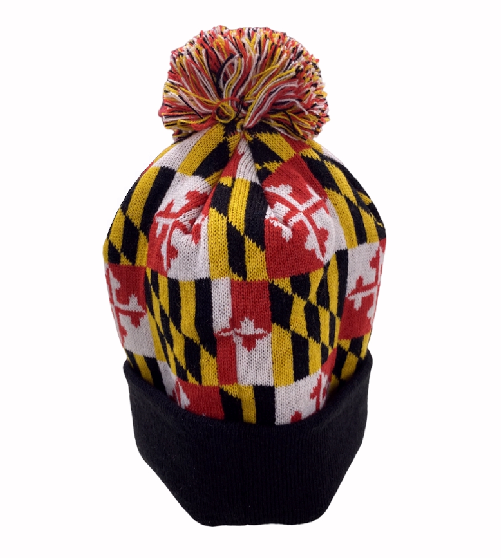 Embrace your Maryland pride with this uniquely designed Maryland Flag Pom Beanie Cap with Black Cuff! Perfect for all occasions.