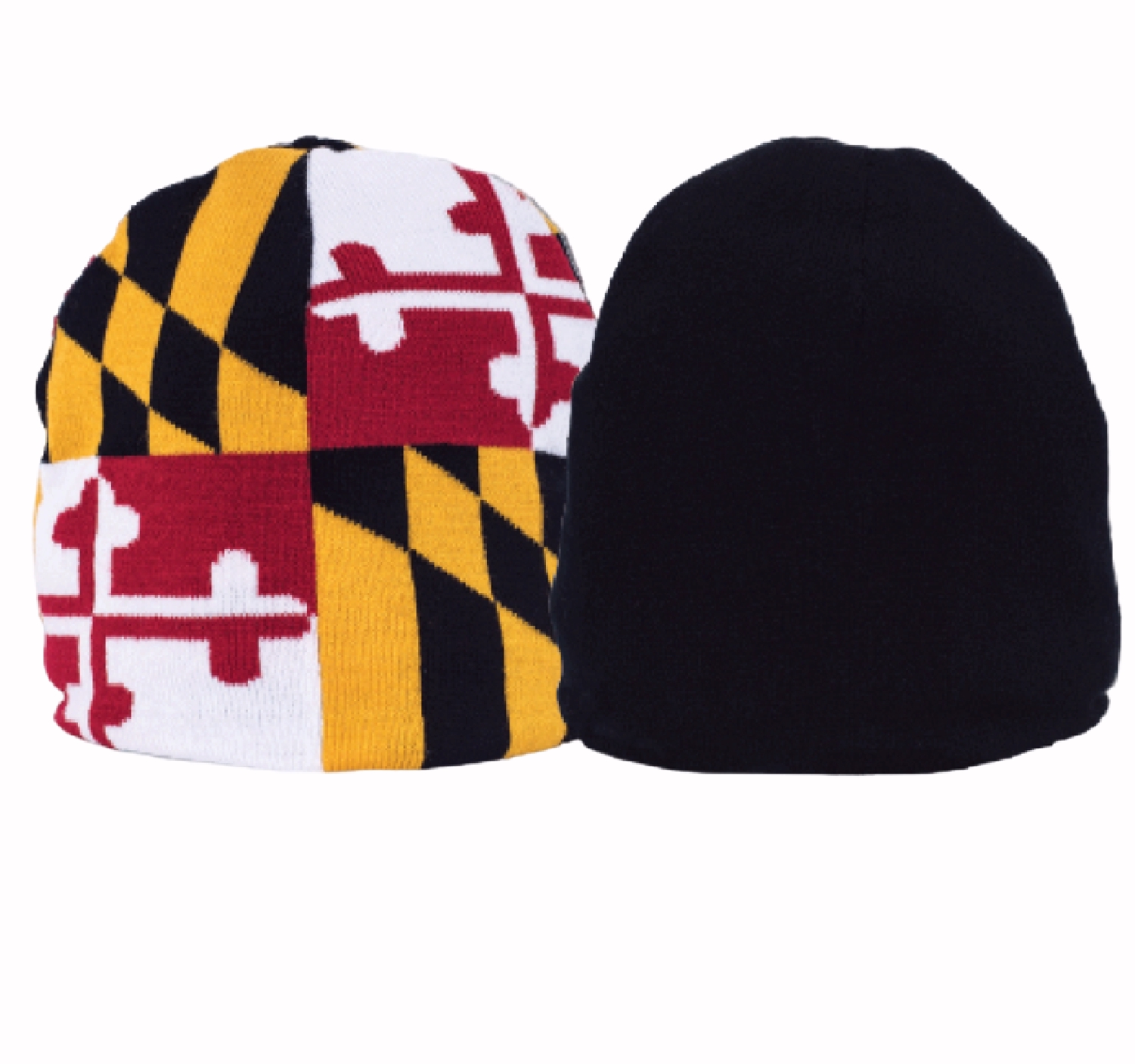 Maryland Flag Reversible Beanie Cap Hat featuring one side with the colors of the Maryland flag and the other side with solid black. Allows you to show your Maryland pride, or go into stealth mode.