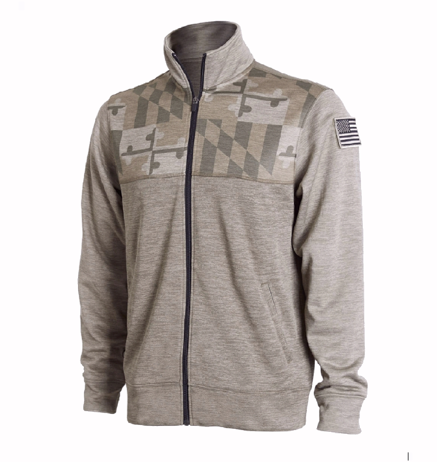 This Maryland Flag Tribute Full Zippered Pocketed Olive Jacket is dedicated to all those that want to show their Maryland pride. This 100% polyester fleece jacket features a subtle Maryland flag graphic print across the chest as well as removable U.S. flag patch to show your patriotism. Complete with two front pockets, this jacket is the perfect companion as the temperatures drop.