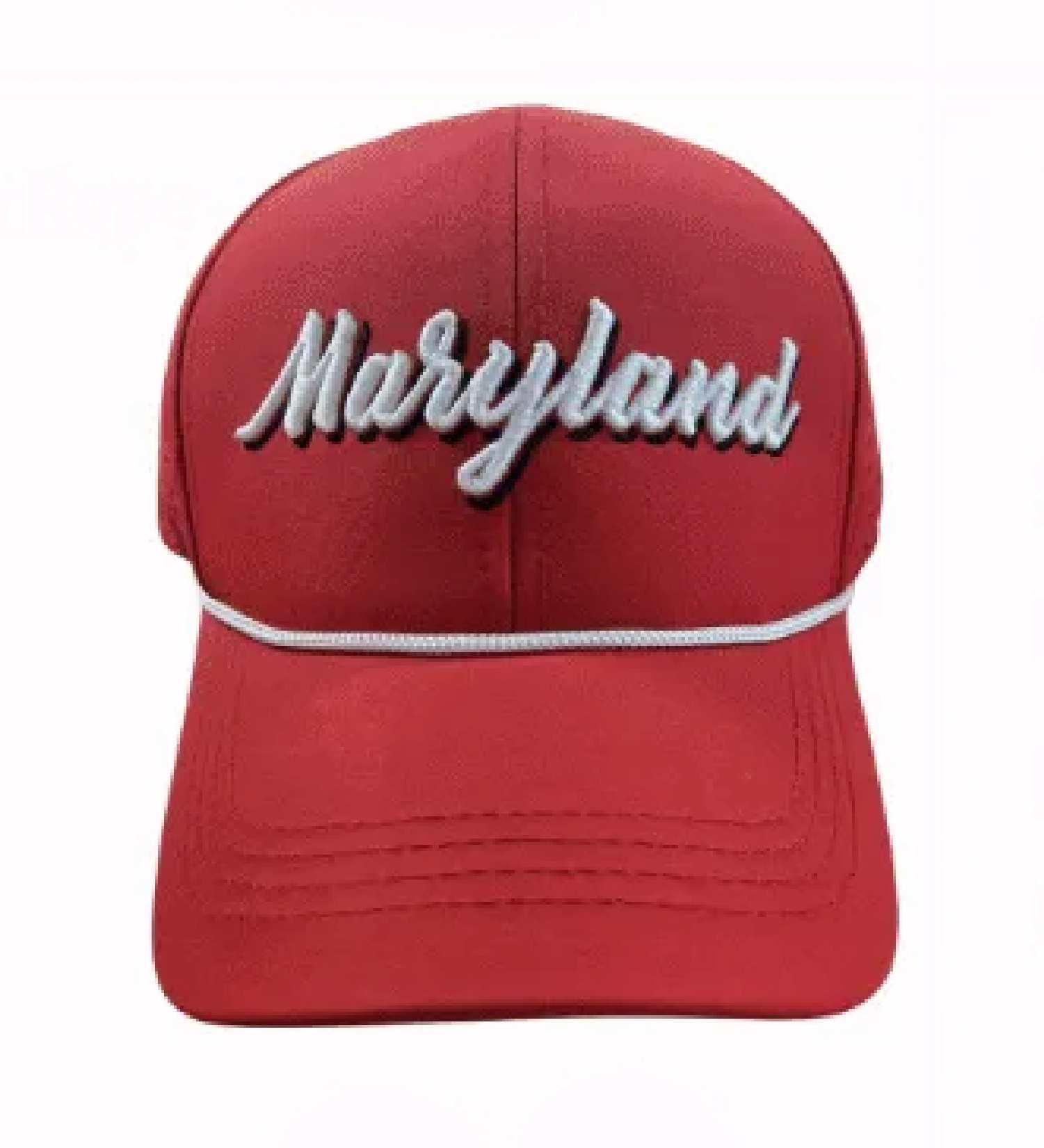 Sport a classic Maryland look in our Maryland Rope Script Cap Hat. This must-have cap for true Maryland lovers is has a solid back with an embroidered patch at the rear. Features an adjustable hook-and-loop closure.