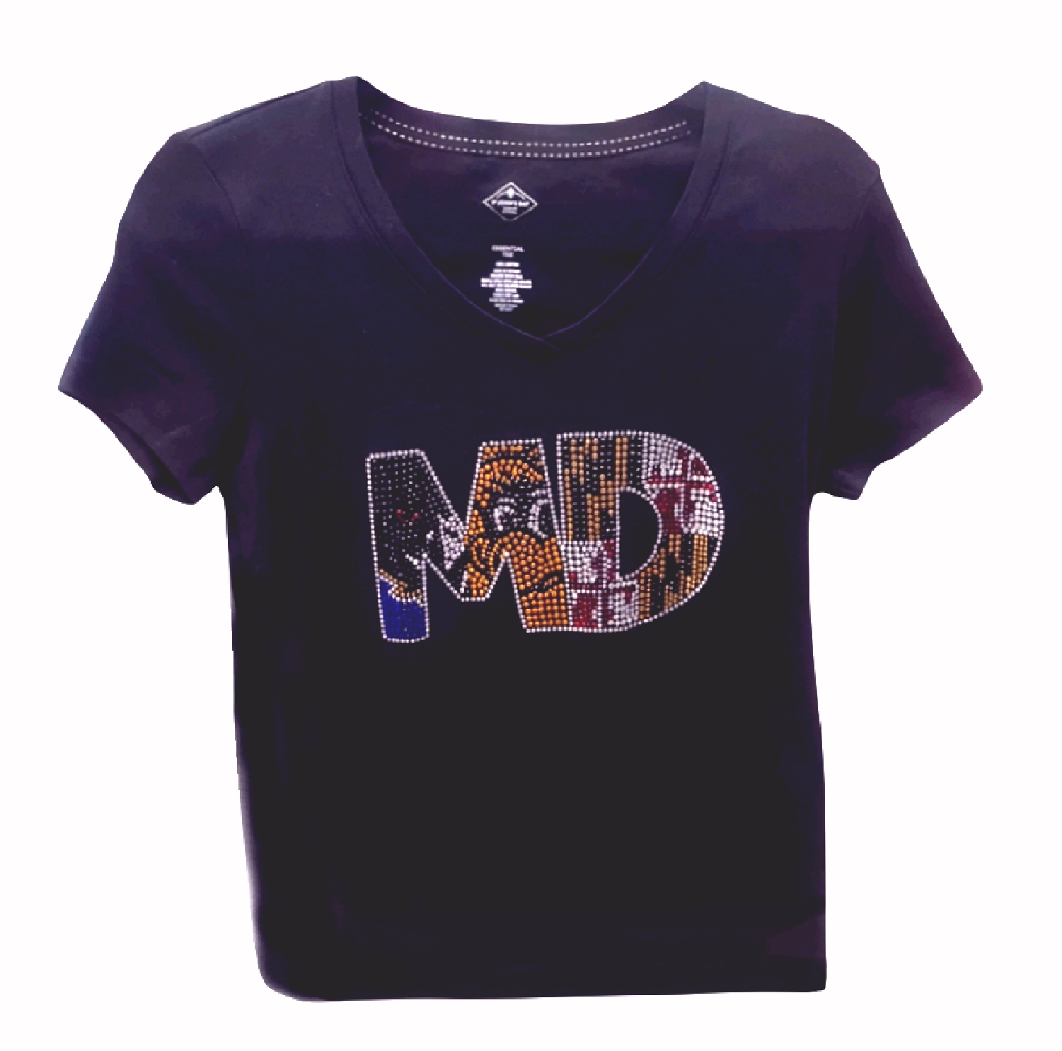 Be seen in this unique and beautiful Maryland Sports and Flag Rhinestone Woman’s V-Neck Short Sleeve Sleeve T-Shirt. Make an impression as the light reflects off these multi-colored rhinestones. Pofessionally pressed onto women’s v-neck short sleeve shirt. This tee provides the softness you crave with unique bling that sparkles.
