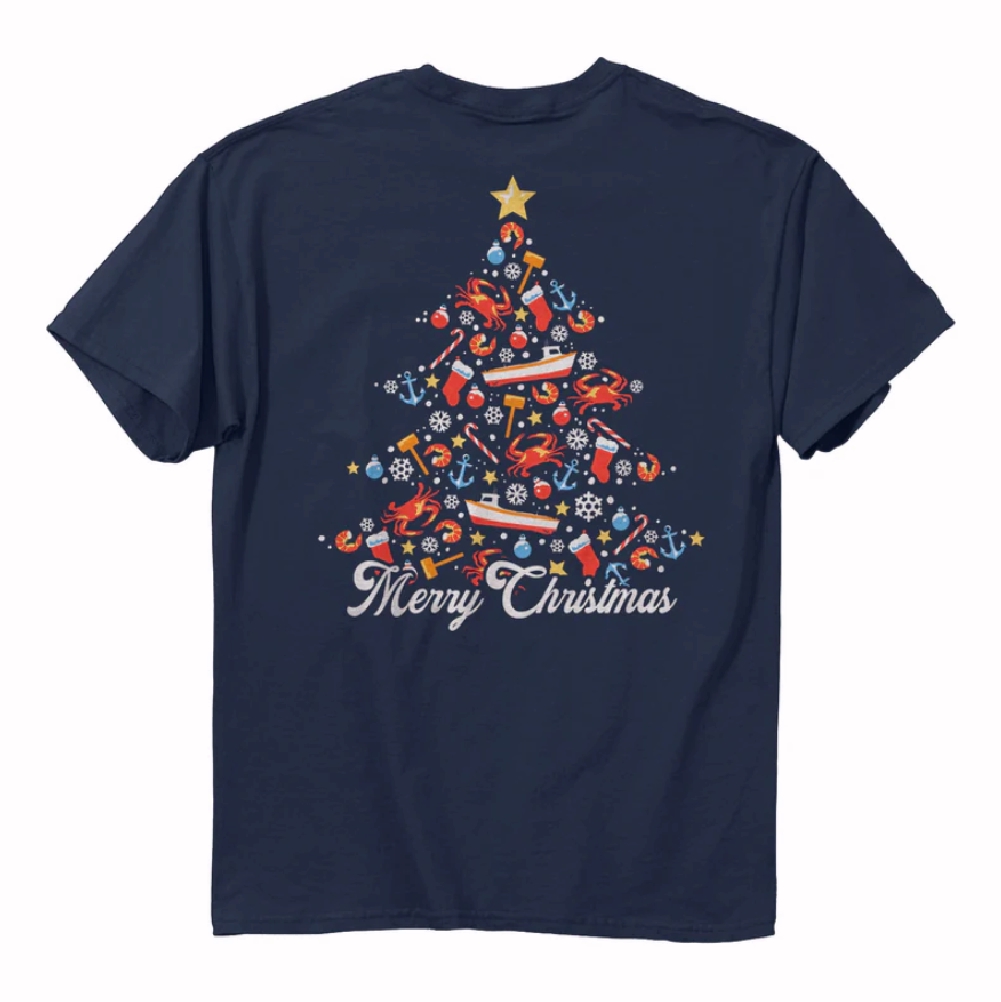 Show off your Christmas pride in our Merry Christmas Sea Themed Christmas Tree Short Sleeve T-Shirt. Featuring candy canes, crabs, boats, shrimp, anchors, stockings and more. The front side chest logo even features a crab wearing a Santa Hat. Made of 100% pre-shrunk cotton, this shirt provides the softness you crave, while the taped neck and shoulder seams offer premium durability.