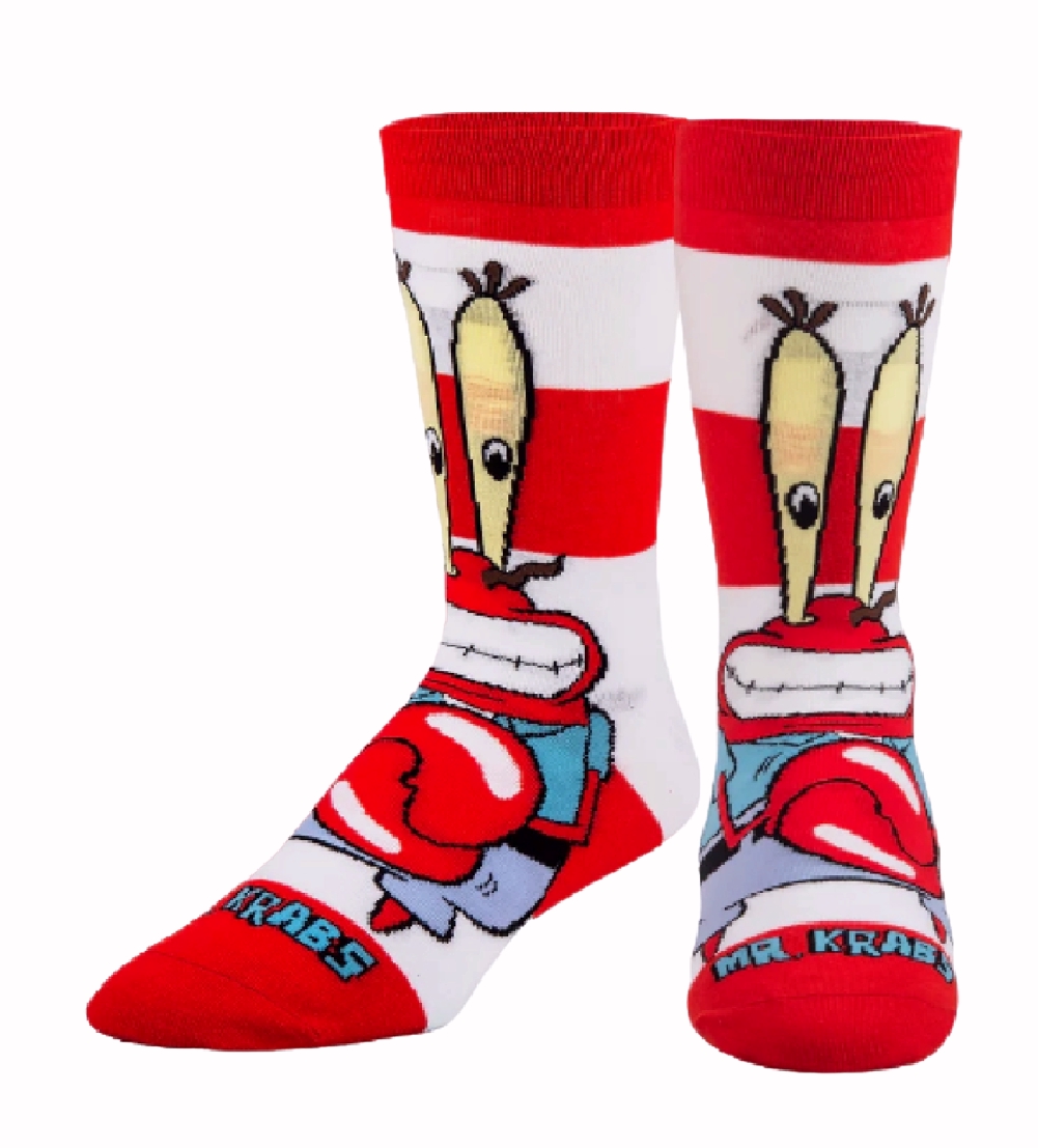 Take a dive into Bikini Bottom in this collection of officially licensed SpongeBob and Nickelodeon crew socks. These Mr. Krabs Red Athletic Crew Socks feature a full graphic print of your favorite owner of the Krusty Krabs, Mr. Krabs, complete with bold red and white stripes. The double layered cotton bottom maximizes cushioning and thickened toe and heel for extra pain relief.