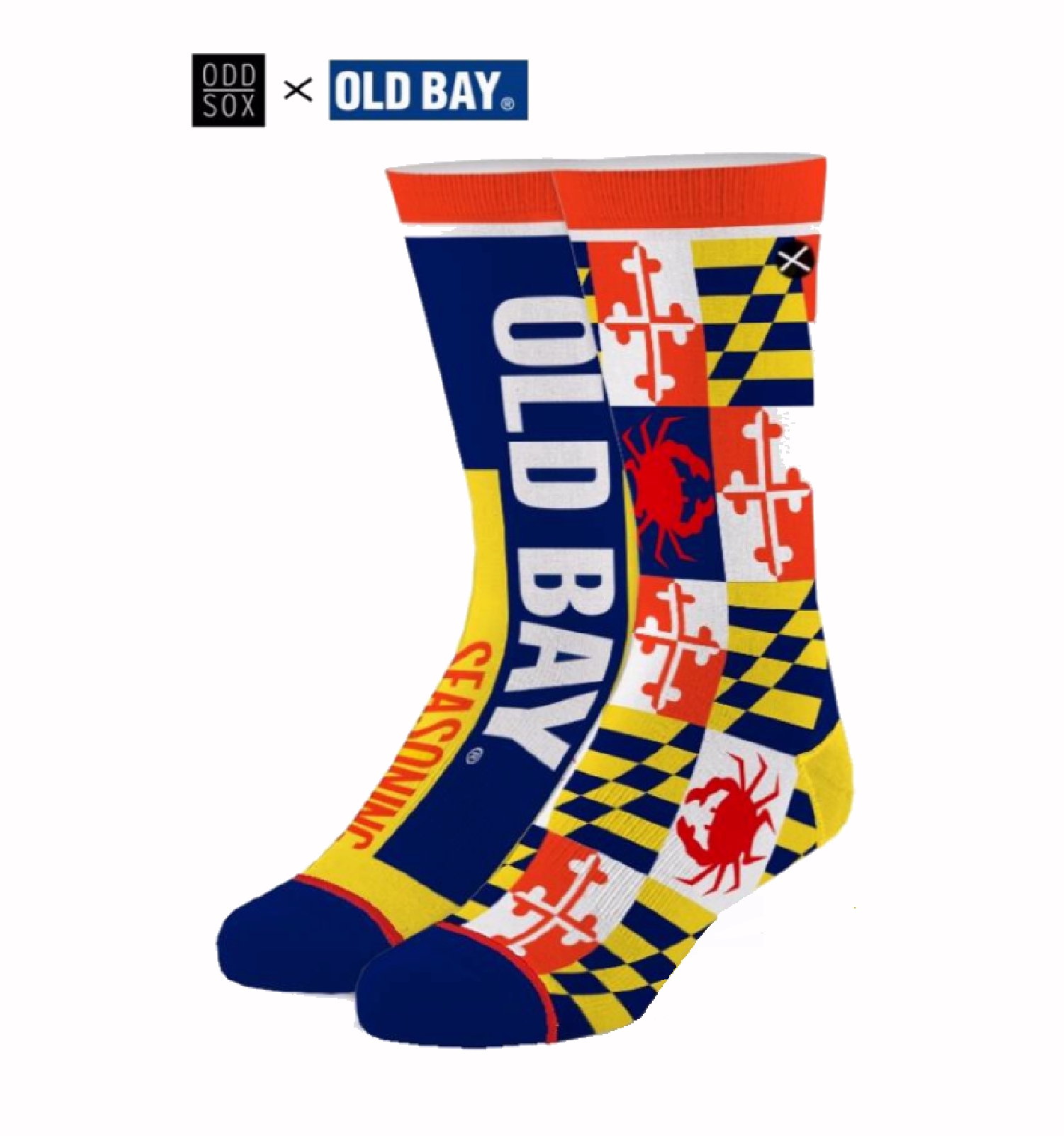 Show your loyality to your favorite spice, which was invented right here in Mayland, with these Old Bay Maryland Flag Split Style Athletic Crew Socks. Featuring a full graphic print of the Old Bay logo on one sock with the Maryland Flag and crab icons on the other. The 100% premium cotton blend enhances comfortability with a double layered cotton bottom to improve cushioning and pain relief.