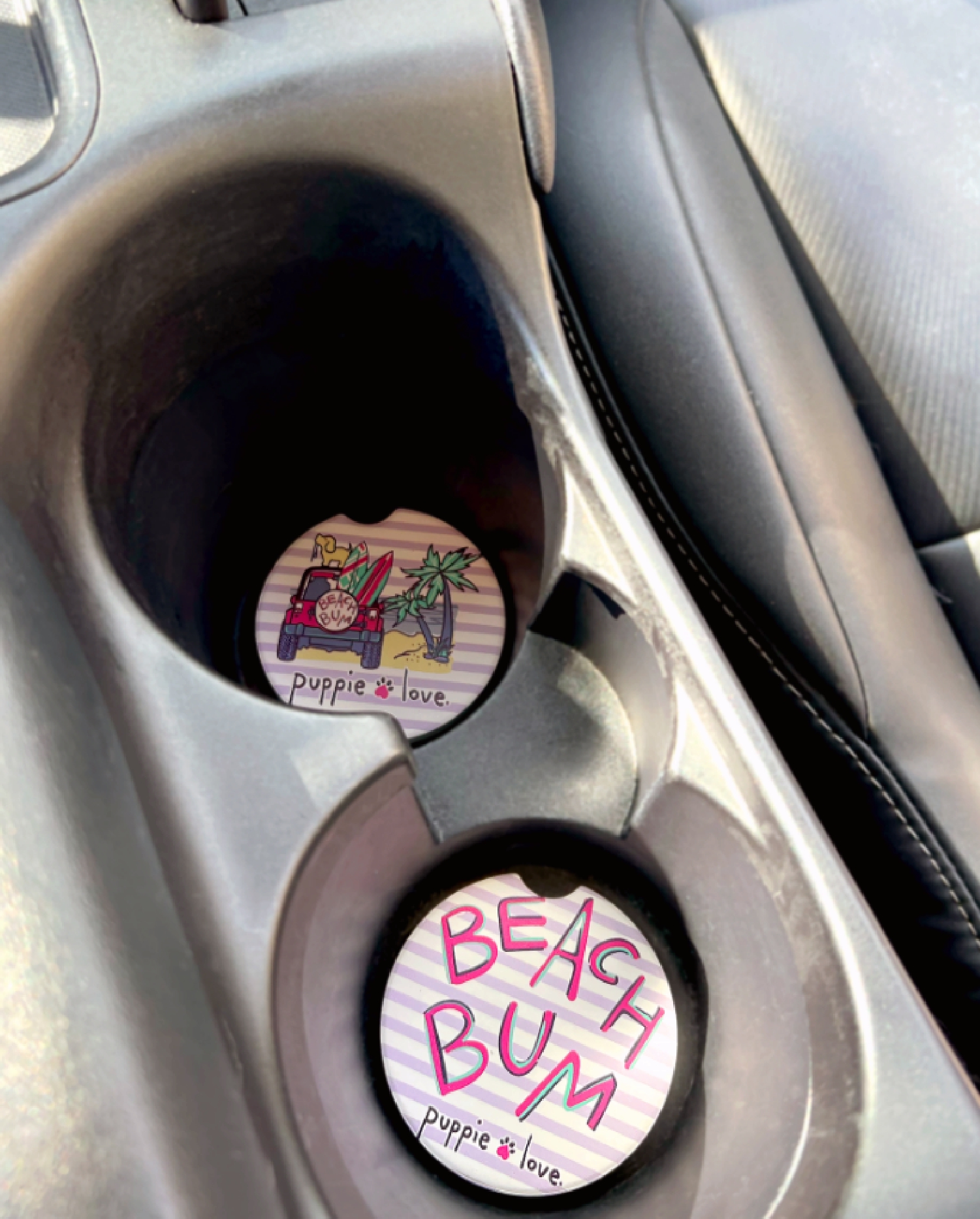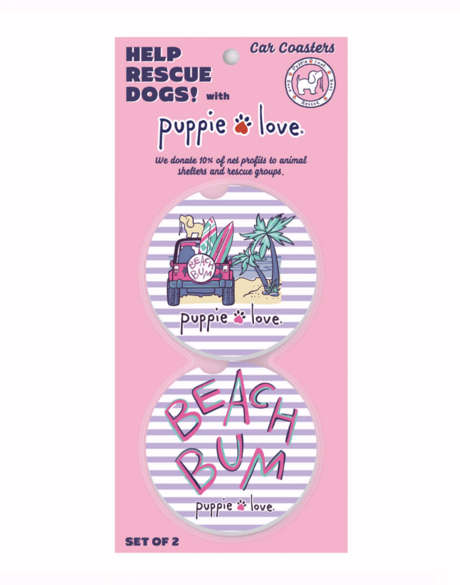 These Puppie Love Beach Bum Car Coasters protect vehicle cup holders from damaging moisture, and can be removed for cleaning and returned for use. They also add a bit of personality to your car. Includes a set of two.