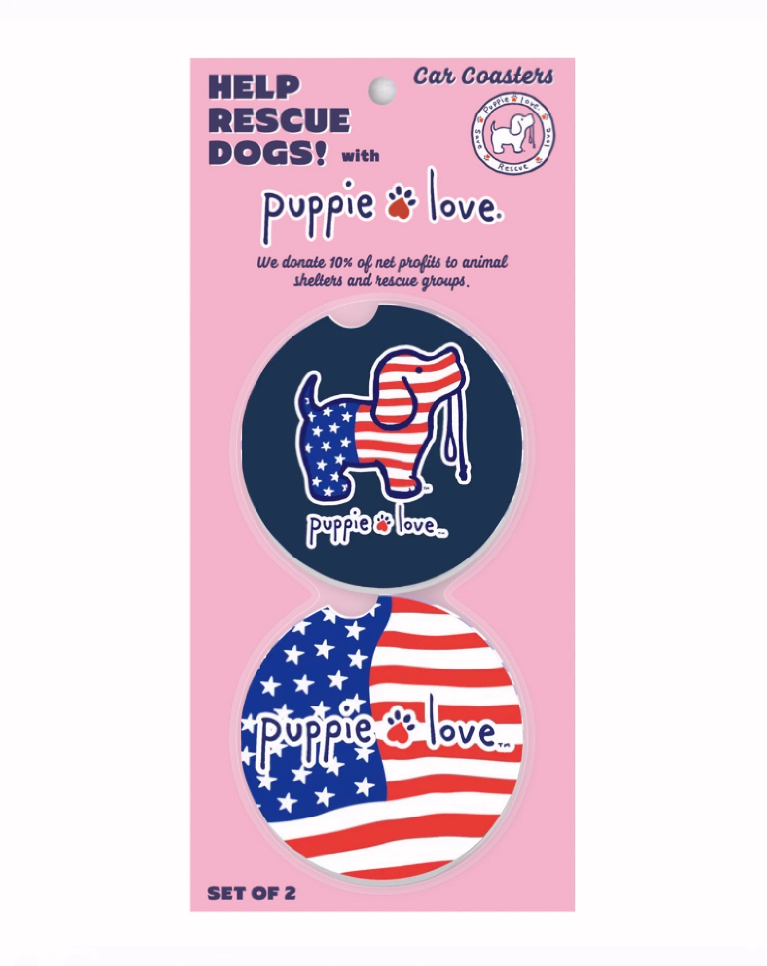 These Puppie Love USA Pup Car Coasters protect vehicle cup holders from damaging moisture, and can be removed for cleaning and returned for use. They also add a bit of personality to your car. Includes a set of two.