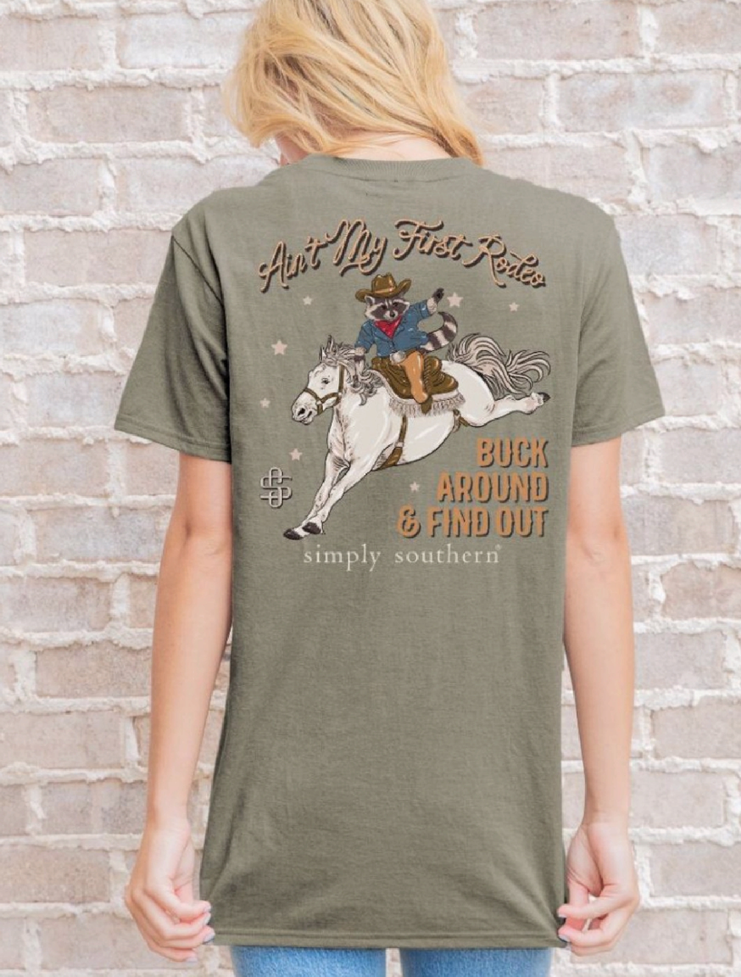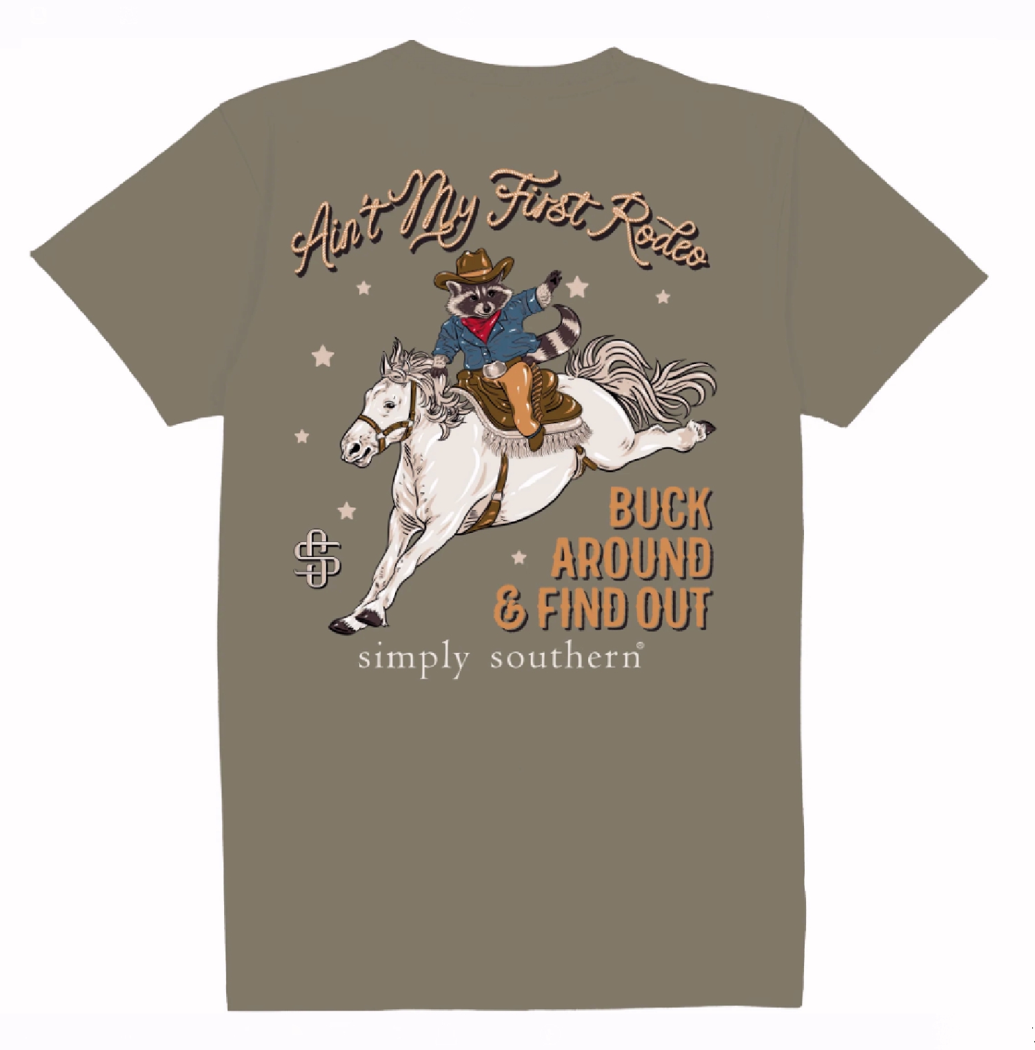 Prairie dust colored Simply Southern Ain’t My First Rodeo Short Sleeve T-Shirt with the phrases “Ain’t my first rodeo” and “Buck around and find out.” Graphic print shows a cowboy raccoon is riding a bucking horse. Simply Southern logo below and similar designs on left chest. Pre-shrunk and ring-spun 100% cotton. Unisex sizing. Simply Southern is an apparel brand that celebrates the casual trendy American lifestyle. Founded in Greensboro, NC in 2005, Simply Southern has been creating vibrant, catchy t-shirts and clothing for more than a decade.