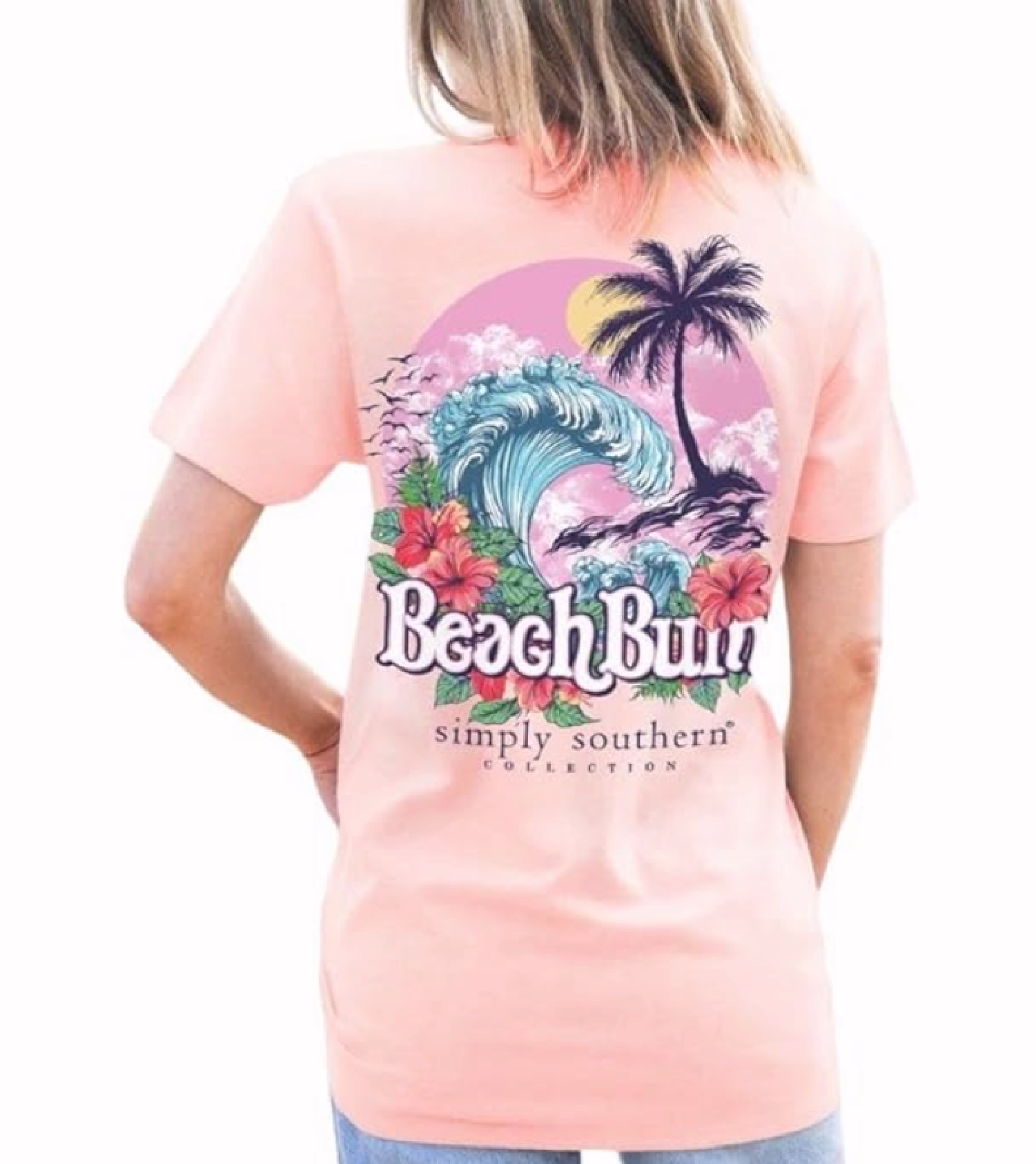 This Simply Southern Beach Bum Flowers and Waves Short Sleeve T-Shirt features a tropical beach scene with a crashing wave, palm tree, and colorful hibiscus flowers. Simply Southern logo below and similar designs on left chest. Pre-shrunk and ring-spun 100% cotton. Unisex sizing. Simply Southern is an apparel brand that celebrates the casual trendy American lifestyle. Founded in Greensboro, NC in 2005, Simply Southern has been creating vibrant, catchy t-shirts and clothing for more than a decade.