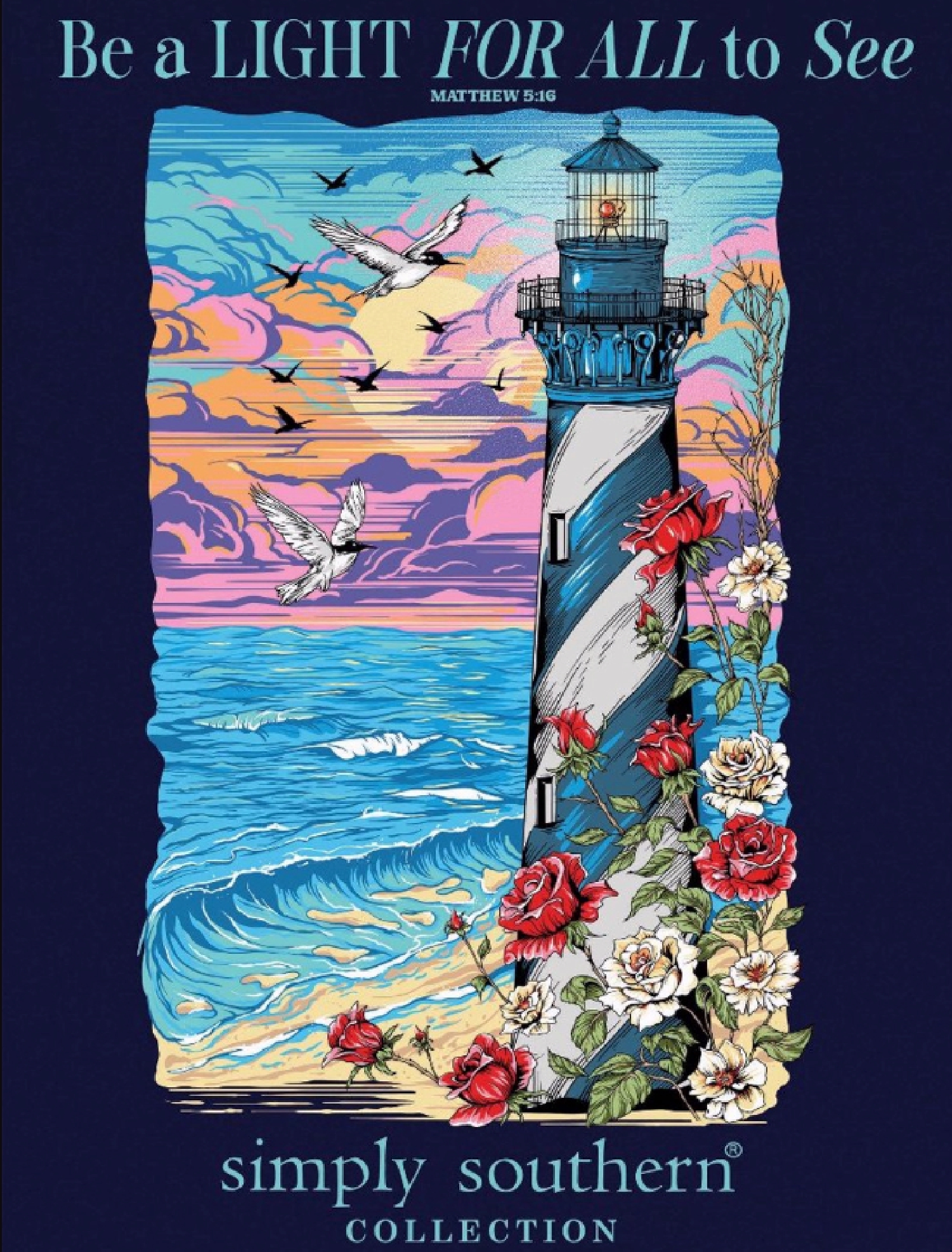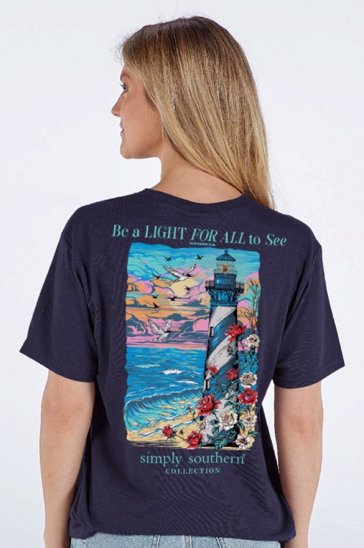 Navy blue colored Simply Southern Lighthouse Be A Light For All to See Short Sleeve Youth T-Shirt with the Bible verse with the verse “Be a light for all to see” with a lighthouse, ocean and florals bordering the lighthouse. Simply Southern logo below and on left chest. Pre-shrunk and ring-spun 100% cotton. Unisex sizing.