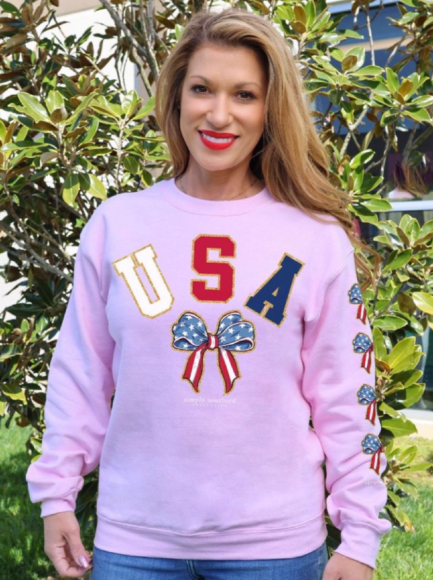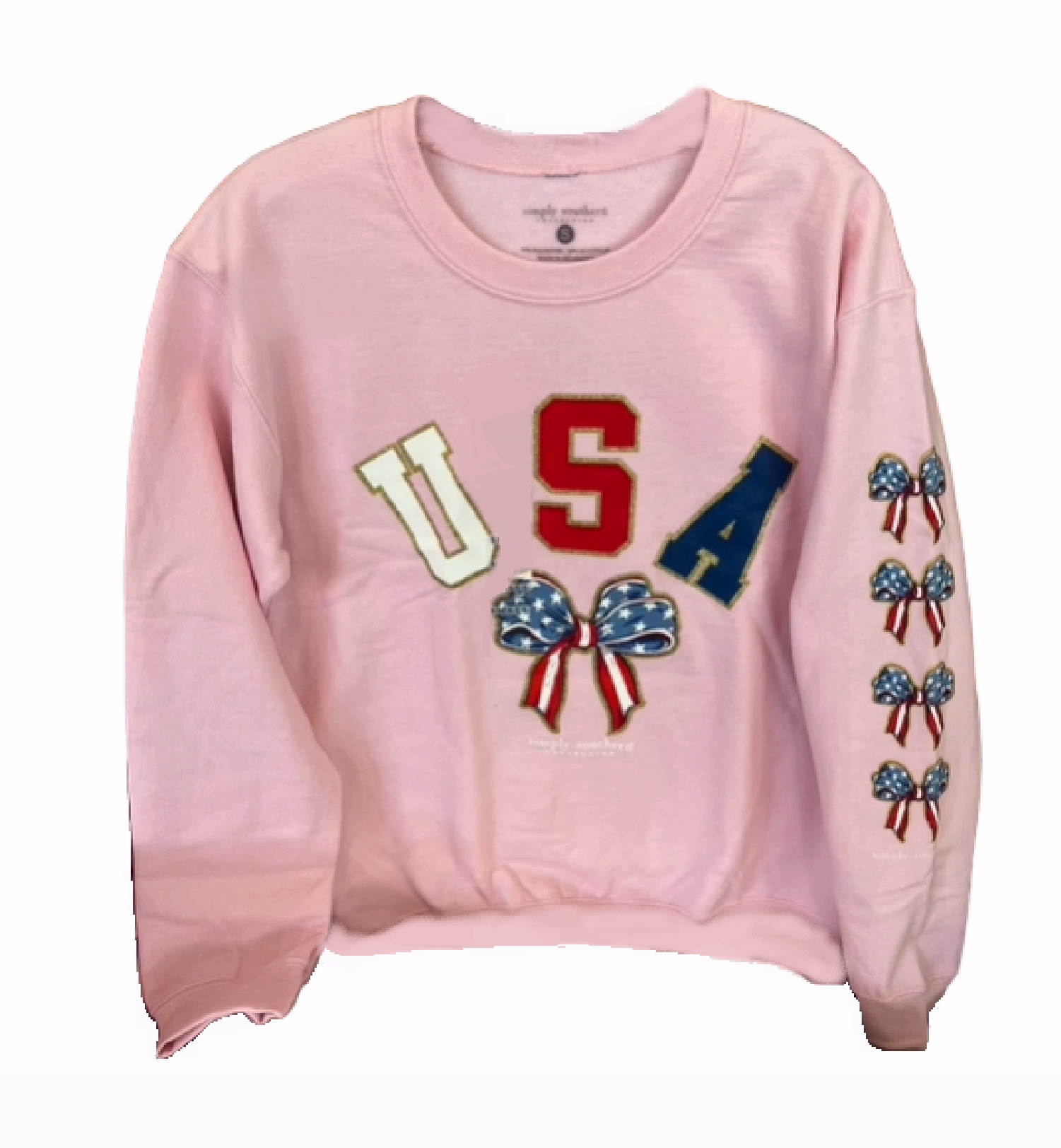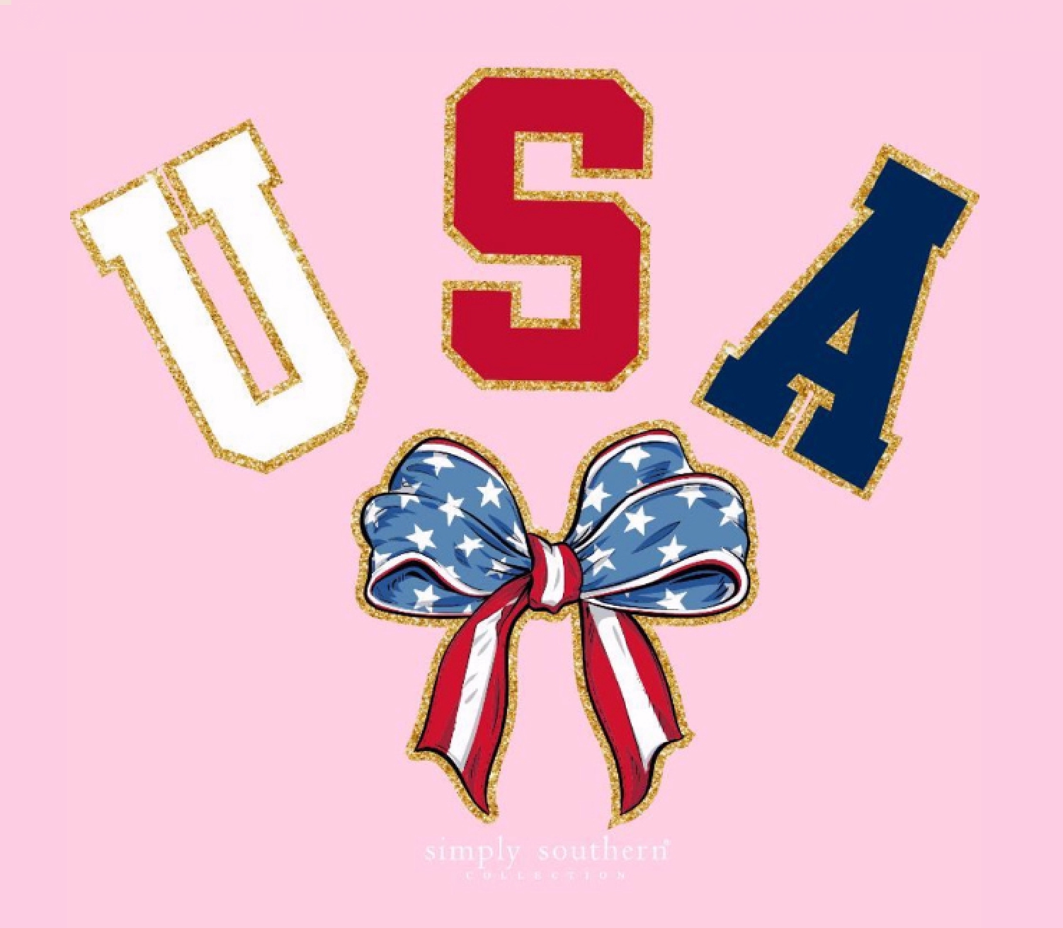 Stay comfy and fashionable in this Simply Southern USA Patriotic Bow Tie Long Sleeve Crew Top Sweatshirt. Light pink long sleeve crew with the letters ‘USA’ outlined in gold glitter. There is a bow filled with the American flag and outlined in gold glitter below and along left sleeve. Simply Southern logo below and on upper back.
