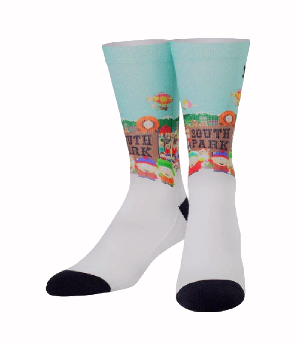 The little town filled with every catastrophe and wild possibilities ever is available in official sock form in these South Park Town Athletic Crew Socks. These white crew socks feature a graphic knitted image of Kyle, Kenny, Cartman and Stan and several other South Park residents and the town sign. The intricate kniting ensures vivid color after every wash and hole prevention.