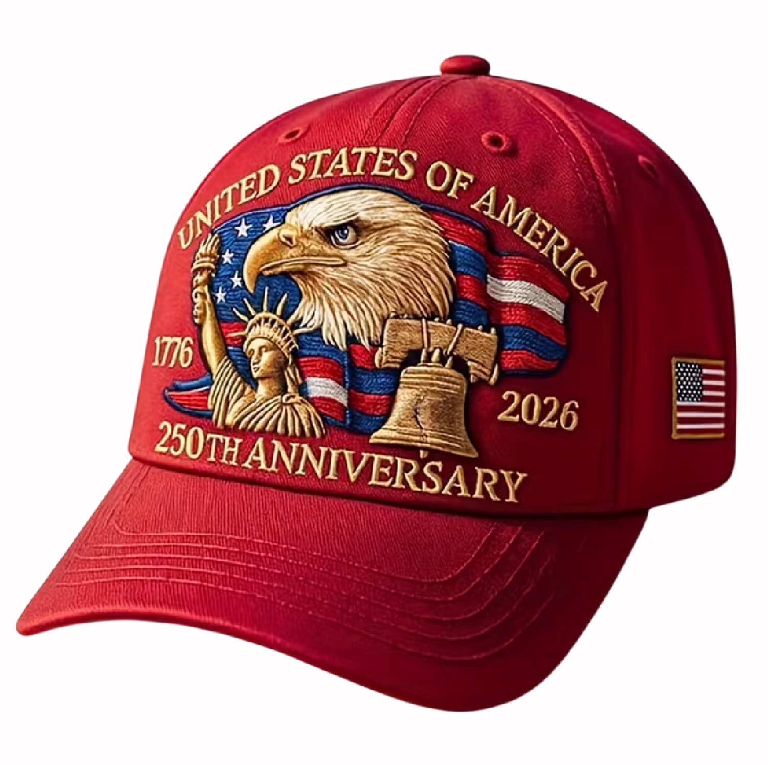 Show your true love for our country with this U.S.A. 250th Anniversary Eagle Statue of Liberty Bell Embroidered Red Cap Hat. Embroidered Eagle, Flag, Statue of Liberty and Liberty Bell on crown. U.S. Flag on left side.