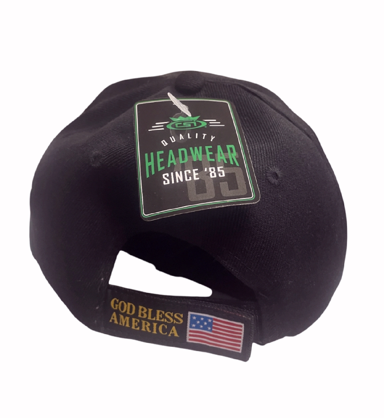 - God Bless America and flag on back strap