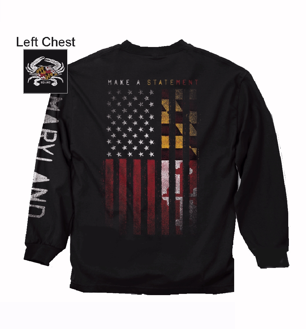 Show your pride and patriotism for your state and your country with our U.S. and Maryland Make a Statement Long Sleeve T-Shirt Sweatshirt. Made of 100% pre-shrunk cotton, this tee provides the softness you crave, while the taped neck and shoulder seams offer premium durability. And, don’t forget to show off that sleeve print – you couldn’t get more patriotic if you tried!