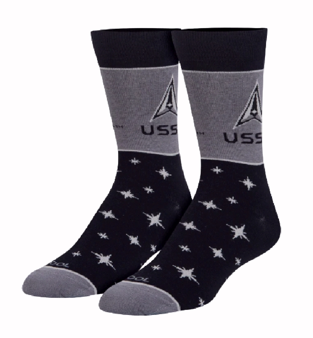 Soar into space and explore as an astronaut in these U.S. Space Force Athletic Crew Socks. These black and gray socks feature the USSF emblem with a star pattern. Made with a premium cotton blend for enhanced comfortability and double layered cushion. These socks are just out of this world.